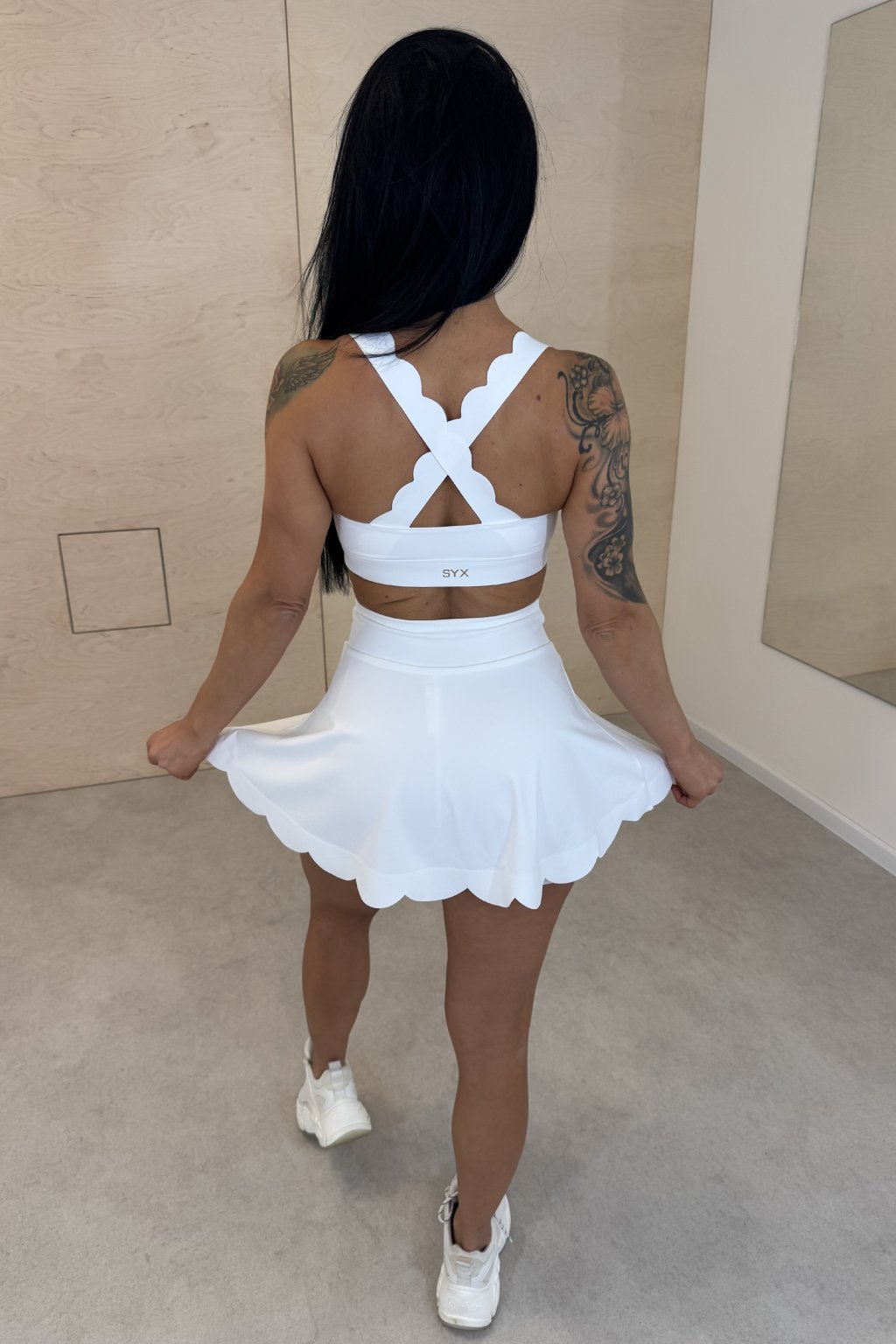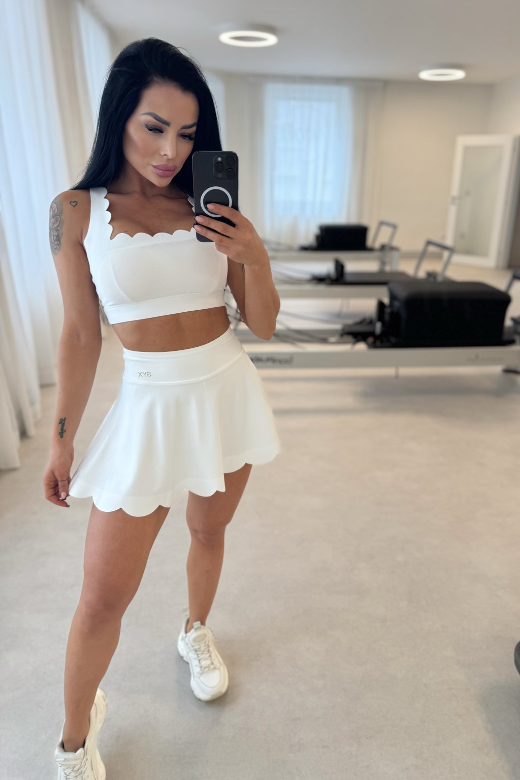 Dámsky biely športový set so sukňou a topom s vlnkovanými detailmi je dokonalou kombináciou štýlu a pohodlia. Tento elegantný a zároveň funkčný set je vyrobený z elastického, priedušného materiálu, ktorý sa dokonale prispôsobí postave a poskytne maximálny komfort pri pohybe. Sukňa s integrovanými šortkami zaručí pohodlie a sebavedomie pri každom tréningu. Ideálny na tenis, fitness, jogu alebo voľnočasové aktivity.